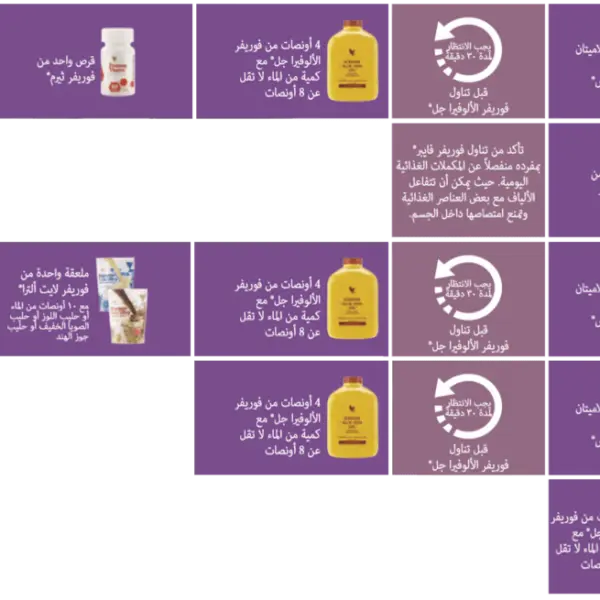 - يفضل تناول العبوات عبر مزجها عصير فوريفر ألوفيرا جل